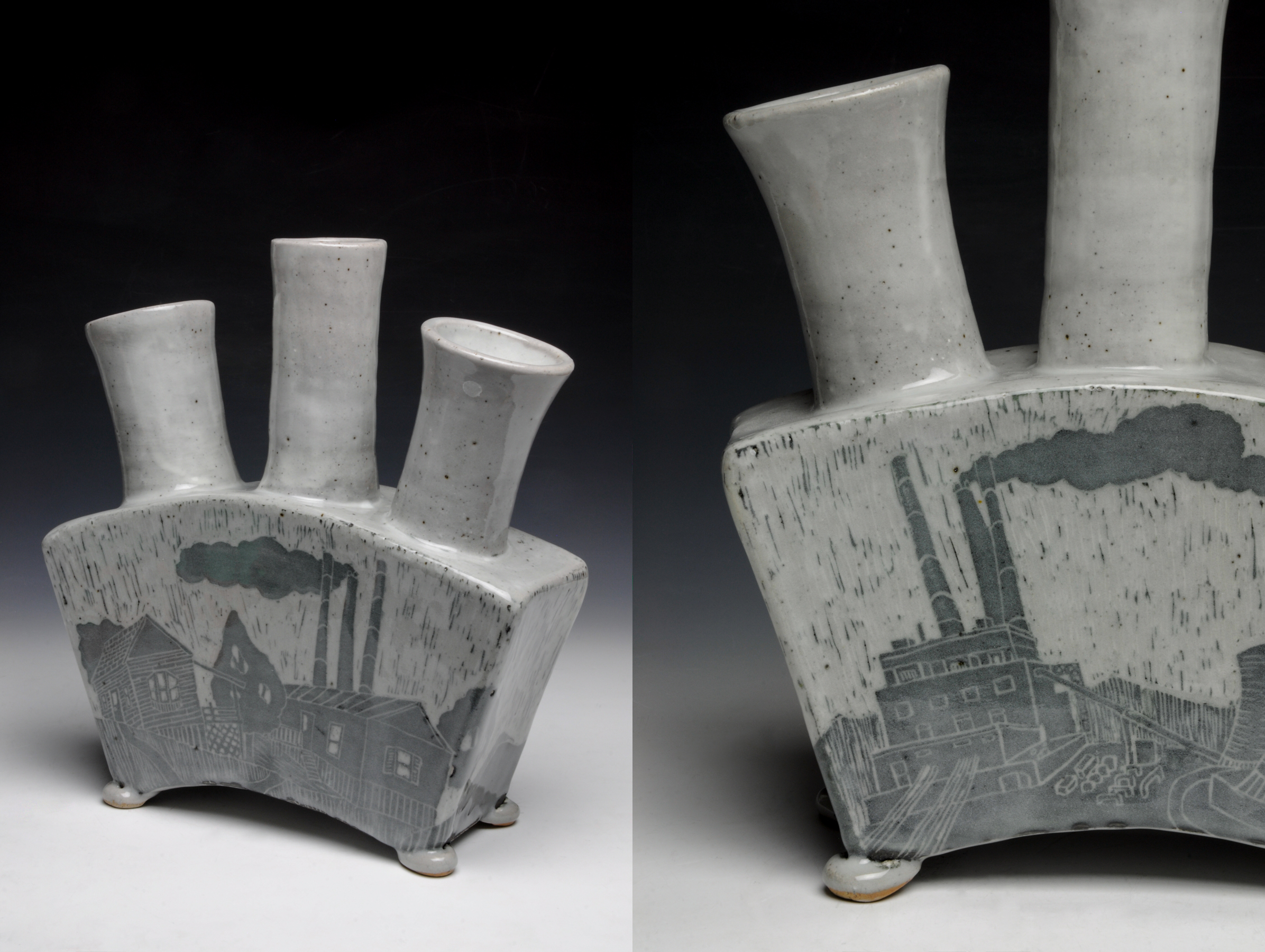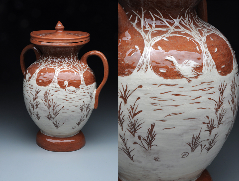 The historical vessel with a contemporary surface is a research-based assignment in which each student reproduces a historical vessel form in an eighteen inch coil built vessel. It is then decorated using white slip and scraffito to create a contemporary narrative relating to the student's lives.