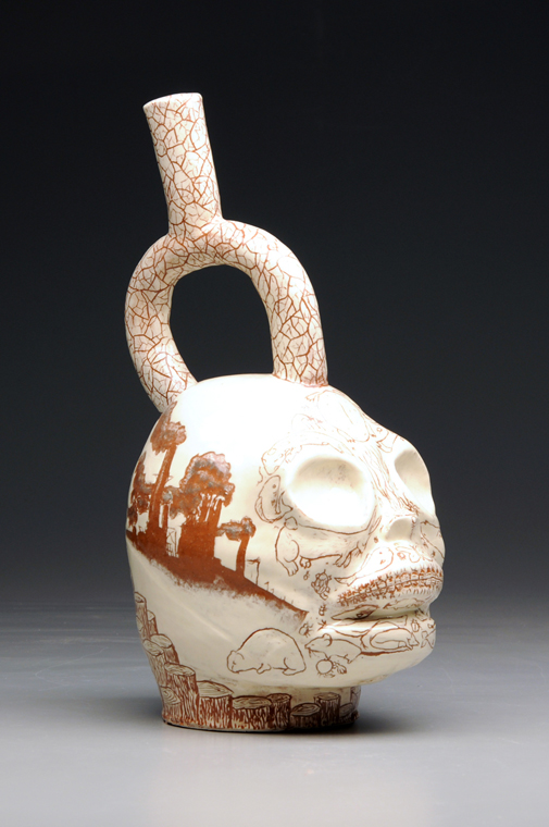 Keith chose to reproduce a Moche vessel with pronounced skeletal features. The imagery and narrative developed for the vessel reflect the impact of global warming on the planet.