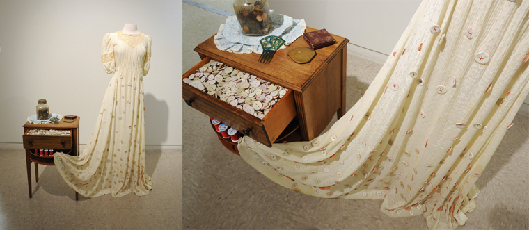 The Intermediate Ceramic Sculpture class builds on the foundation developed in beginning ceramics. It is designed to teach the aesthetic and technical skills needed to create sculptural work from ceramic materials. Assignments are based on building methods or skills that allow students to begin developing content and a personal aesthetic. This assignment was to work with multiples. Hannah made over 1000 ceramic buttons that were then sewn to her mother's wedding gown.