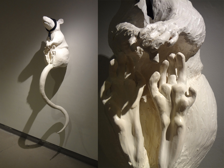 The Intermediate Ceramic Sculpture class builds on the foundation developed in beginning ceramics. It is designed to teach the aesthetic and technical skills needed to create sculptural work from ceramic materials. For this assignment the goal is to create a piece that exceeds three feet in any dimension. The body of this rat was built solid, cut apart and hollowed out, and then reassembled.