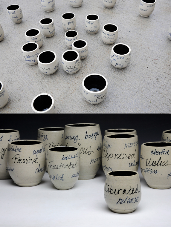 These cups are part of a 45-piece set. They use words and their synonyms to describe emotions that have had a major effect on the student’s life.