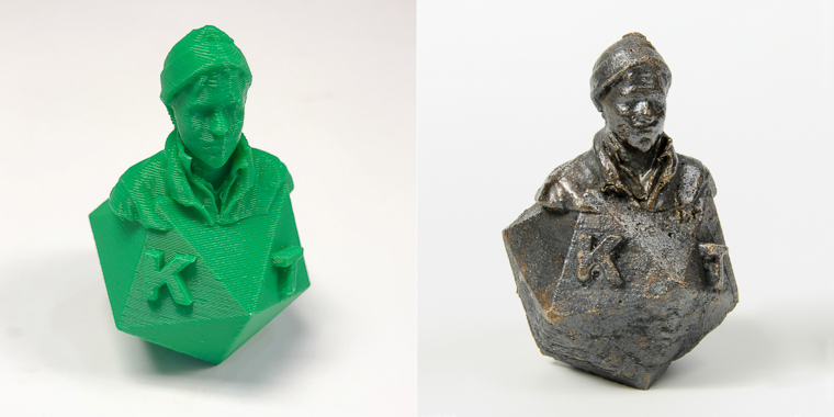 The hand-held Sense Scanner was used to create a portrait bust that was altered in Tinker CAD and printed in PLA. The PLA print was then used to make an investment mold and cast in bronze.