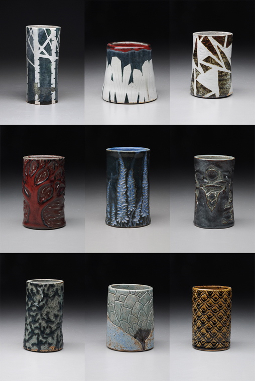 Making a well-crafted cylinder is the foundation of students' introduction to throwing on the wheel. This assignment asks students to thrown eight inch tall cylinders with straight even walls, a level and considered lip, and an finished undercut foot. The cylinders are then decorated using slips, stencils, scraffito, and carving. The goal is to create a cylinder in which the decoration activates the surface and prompts further visual exploration.